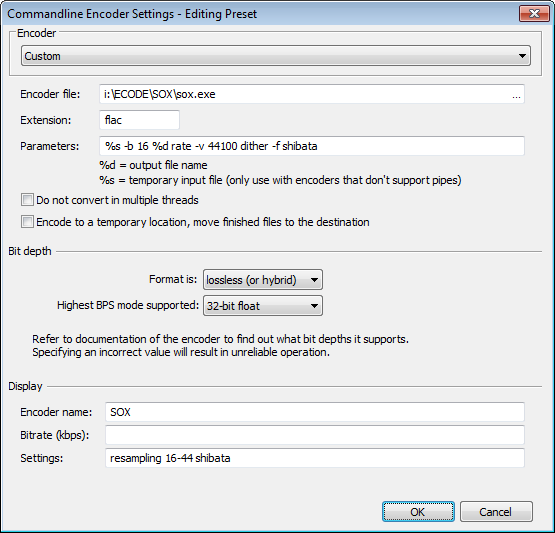 На виході отримаємо файл(и) з глибиною квантування 16 біт та частотою дискретизації в 44100 Гц. З яких можна зліпити й кустарний Audio-CD. Але, це дуже окрема історія. Якщо є бажання застосувати noise shaping типу ‹shibata›, рядок параметрів буде виглядати так: (`type "%WL"`) do "i:\ECODE\SOX\sox.exe" "%%f" -V -b 16 "%%~dpnf-1644_shibata.flac" rate -v 44100 dither -f shibata